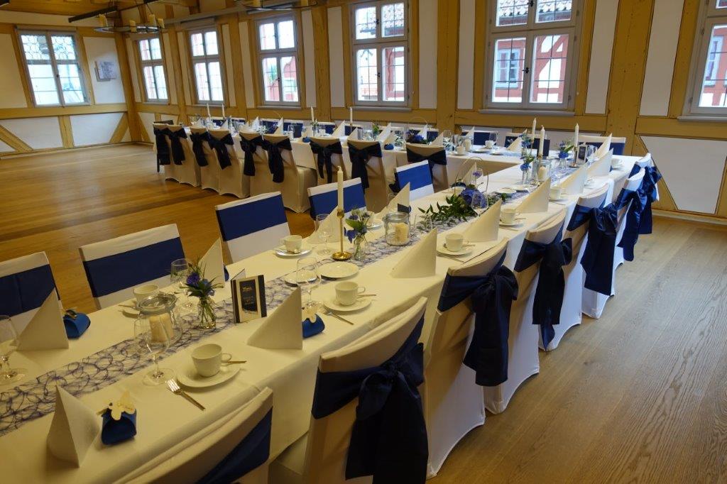 Unsere Stuhlhussen waren bereits mehrfach in der Alten Vogtei im Einsatz und sind auf dem Foto zu sehen. Sie zeigen, wie die Hussen die Einrichtung harmonisch ergänzen und die Atmosphäre des Saales sichtbar aufwerten.