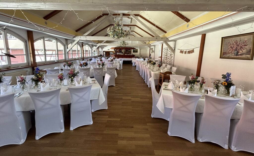Unsere Stuhlhussen waren bereits mehrfach in der Fischerei Oberle im Einsatz und sind auf dem Foto zu sehen. Sie zeigen, wie die Hussen den Raum optisch veredelten und die Dekoration ideal ergänzten.