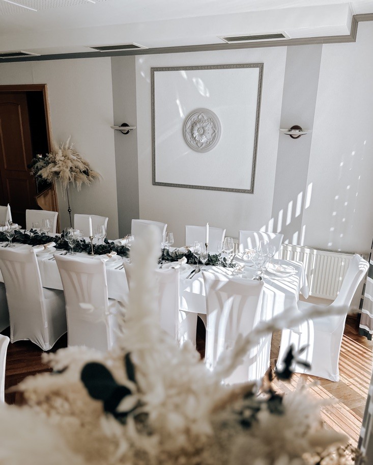Unsere Stuhlhussen waren bereits mehrfach in der Heidjer-Stube im Einsatz und sind auf dem Foto zu sehen. Sie zeigen, wie harmonisch sich klassische Eleganz mit dem warmen Charakter des Restaurants verbindet und den Raum sichtbar aufwertet.